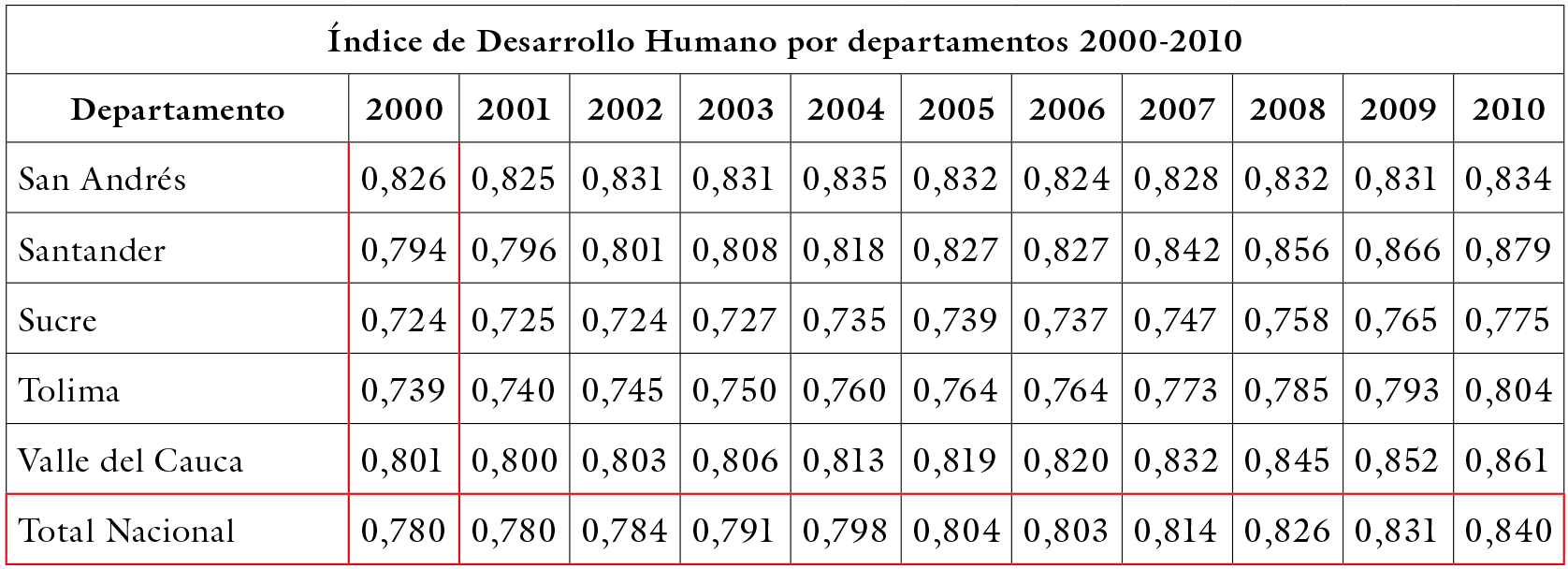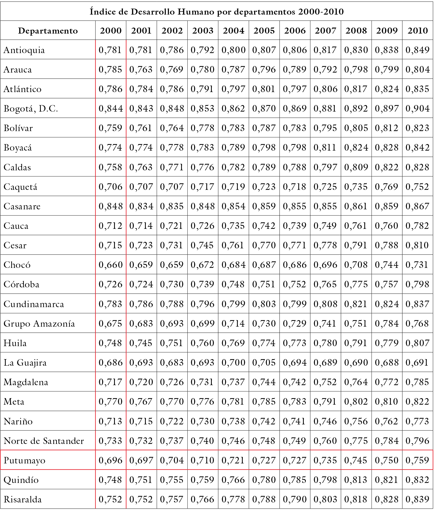 Al revisar el Índice de Desarrollo Humano (IDH) para Colombia se encuentra que, entre el 2000 y el 2010 este aumentó en seis puntos, pasando de 0,78 a 0,84; cifras que muestran mejoría en las condiciones de bienestar de la población para la primera década de este siglo, ello acorde con la tendencia mundial. Sin embargo, estas cifras contrastan con la alta heterogeneidad que se vive al interior del país; en tanto Bogotá aumentó su IDH en este período en seis puntos (pasando de 0,844 a 0,904), el mayor en el país, la Guajira tan solo lo hizo en medio punto, mientras que Putumayo pasó de 0,696 en el año 2000 a 0,759 en el 2010 (DANE, 2017). En la tabla 1 se aprecia que, para todos los años de este decenio el Putumayo ha estado bastante por debajo de la media nacional, creciendo también menos que el promedio del país y que, al 2010, su IDH es inferior a la media nacional de inicios de siglo y todavía mucho menor al de Bogotá, Valle del Cauca, Antioquia o los departamentos de Casanare, Santander, Boyacá o Meta, más cercanos en sus características, al del Putumayo. Es decir, sus condiciones combinadas de vida (ingresos económicos, esperanza de vida y tasa de escolaridad) están aún lejanas de las que gran parte del país tenía hace más de una década.