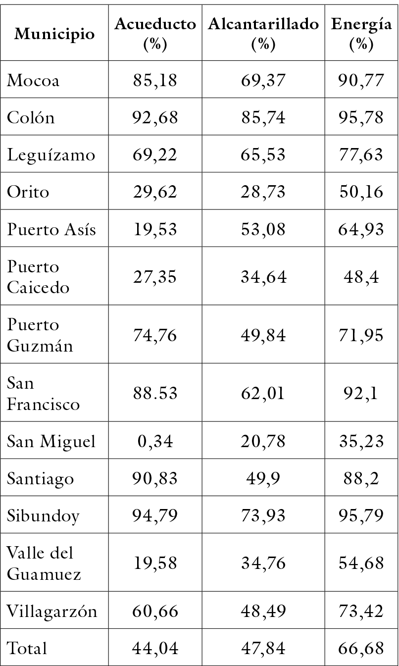 La cobertura de servicios públicos no es muy diferente, todo el departamento presenta una relativamente baja cobertura de ellos; en acueducto tiene el 44%, en alcantarillado un 48% y un 67% en energía eléctrica (DANE, 2005), habiendo también profundas diferencias entre los municipios (tabla 2). Asimismo, el índice de necesidades básicas insatisfechas (NBI) en el departamento es del 36%, superior al nacional que está en 28% y la proporción de personas en miseria es ligeramente superior al promedio nacional, 8,8% frente a 8,1 % (DANE, 2005).