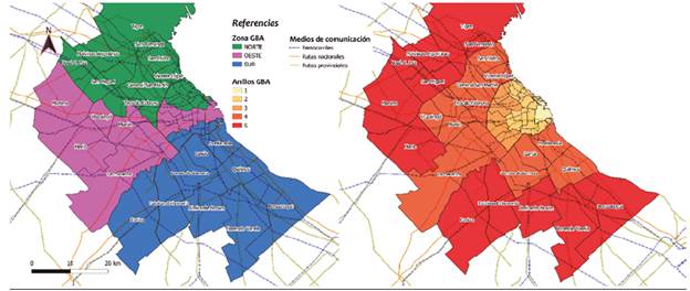 Por último, los 24 partidos de la Provincia de Buenos Aires que integran el GBA también presentan importantes heterogeneidades, que es posible describir a partir de una doble diferenciación de los territorios. Primero, nuevamente se repite la distinción entre un norte con mejores condiciones sociales y de ingreso, frente a un sur empobrecido. Y segundo, esta realidad se complejiza al ser atravesada por una segunda dimensión marcada por el empeoramiento de las condiciones a medida que los partidos se ubican más lejos de la CABA, estableciéndose "cordones" de cercanía/lejanía caracterizados por indicadores sociales diferenciados (véase figura 3). Esta tensión entre el sector norte y sur se refuerza a su vez por la expansión y presión habitacional de los sectores medios y altos de la CABA hacia los cordones periurbanos en el norte del GBA, que en los últimos años ha convertido a este sector en un espacio de importante desarrollo del mercado inmobiliario en torno al desarrollo de los barrios residenciales y cerrados.