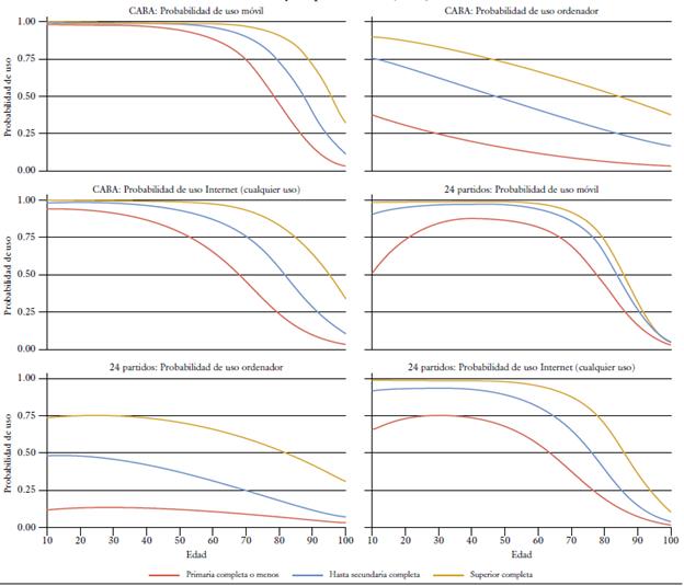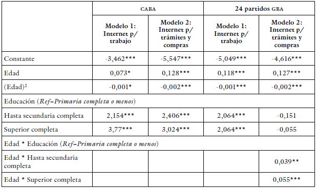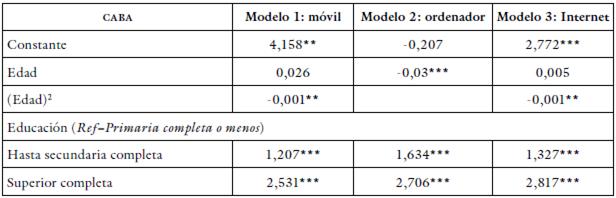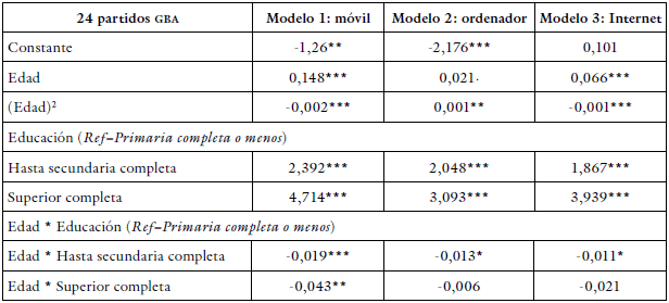 Tanto la ENTIC como el Mautic son relevamientos muestrales, y por lo tanto, los dominios de sus afirmaciones están limitados a grandes escalas urbanas -en este caso, la CABA y los 24 partidos del GBA-. Teniendo en cuenta este sesgo, en el presente trabajo proponemos utilizar dichas fuentes para la construcción de un conjunto de modelos de regresión logística que nos permitan, a partir del uso de datos del Censo 2010 -último realizado en Argentina del que se dispone información y tercera fuente involucrada en este estudio-, predecir a escala microterritorial el acceso y las modalidades de usos de las TIC. La metodología utilizada se basa en los hallazgos de Barañano Cid et al. (2019), quienes destacan la estrecha relación empírica observada entre el nivel educativo y la edad, y el acceso a las tecnologías. Partiendo de corroborar esta relación para el GBA, se calculan diferentes modelos de regresión logística a partir de la ENTIC y la Mautic. Estos modelos son luego utilizados para predecir el acceso y uso de los TIC utilizando los datos del Censo,7 lo cual permite tener una aproximación a escala microterritorial del acceso y uso de las TIC. Los modelos de regresión construidos toman como variable independiente la edad y el nivel de estudio de las personas de 15 años o más, y como variable independiente las variables de acceso y las modalidades de uso de las TIC.8 A su vez, atendiendo a las diferencias que se observan en el uso de las TIC entre la CABA y el resto de GBA, se realizaron regresiones diferenciadas para cada una de las jurisdicciones.9