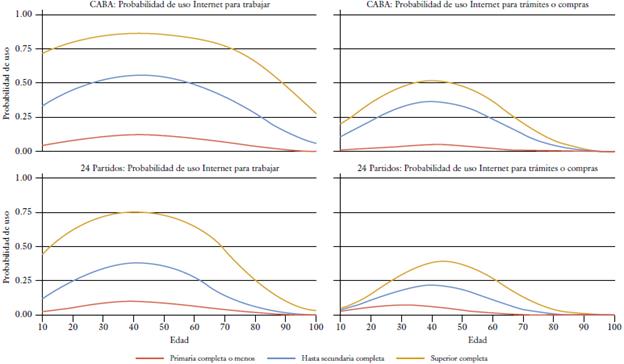 Al revisar los resultados de la tabla 6 se observa que en estas modalidades de usos -más "específicas" y con mayor relación a las demandas de una ciudad inteligente-, se profundiza aún más la brecha entre CABA y los partidos del GBA. Nuevamente es importante recordar que estos porcentajes se expresan sobre el total de personas que usan Internet, por lo cual, si se considera el total de personas, estas diferencias serían aún mayores. Entonces, en consonancia con lo mencionado en cuanto a el acceso a TIC y a la frecuencia de uso de Internet, estas modalidades presentan una fuerte relación con la edad y con el nivel educativo. Sin embargo, es posible hacer algunas distinciones con referencia a lo que hemos señalado respecto a el acceso. En primer lugar, si bien el uso de Internet por motivos laborales y para trámites y compras encuentra una fuerte relación con la edad, esta relación no es tan lineal o directa como veíamos en los análisis respecto a los usos. Allí, encontramos que la categoría de personas entre 35 y 44 años es la que más usa Internet por motivos laborales y para trámites. Más allá de esta característica, son nuevamente las personas de 65 o más quienes tienen el porcentaje más bajo en todas estas modalidades de uso. Por su parte, la relación entre estas modalidades de uso y el nivel educativo es mucho más fuerte que el efecto de la edad. En particular, se profundiza la diferencia entre quienes tienen estudios superiores y el resto. En esa perspectiva, las personas con estudios superior tienen porcentajes mucho más elevados de estas modalidades de uso que el resto de las personas.