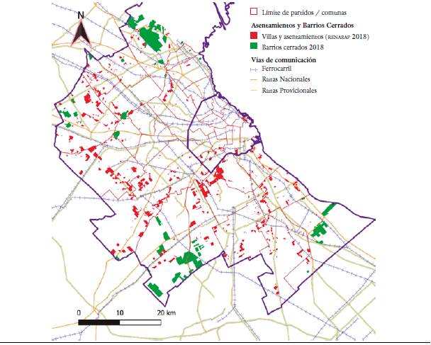 Como es de esperar, por su tamaño, este aglomerado no constituye una realidad homogénea, sino que, por el contrario, concentra profundas desigualdades económicas y sociales, que se manifiestan territorialmente en su diferenciación y desigualdad espacial. En este sentido, la primera y más visible de estas heterogeneidades viene dada por la distinción entre, la CABA, y, los 24 partidos del GBA. Dicha desigualdad se expresa en la importancia económica y social de la ciudad capital, que actúa como centro y núcleo del conglomerado urbano, siendo el espacio en el que confluyen la mayor parte de las redes de transporte y donde se encuentran los centros políticos del país. Por su parte, los partidos del GBA concentran los núcleos más populosos, en los que se destacan los extensos cordones de indigencia ("villas" y "asentamientos"), a los que, en las últimas décadas, se han sumado los barrios cerrados ("country") producto de la expansión demográfica de la CABA (véase figura 2). A su vez, los partidos del GBA concentran los establecimientos industriales más importantes de la región, mientras que la CABA funciona como un importante centro comercial y financiero.