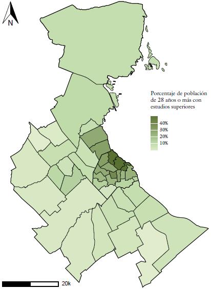 Así mismo, en cada una de estas dos grandes subregiones encontramos importantes diferencias y desigualdades. Considerando solo la CABA, se puede visualizar claramente una diferenciación entre el "corredor norte" y el "corredor sur", lo cual se expresa, por ejemplo, en los desiguales niveles educativos de su población. En tal sentido, el corredor sur es el que agrupa la mayor parte de los asentamientos y villas (véase figura 2 y 3).