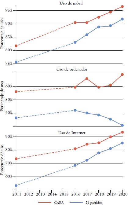 Con el objeto de tener una perspectiva histórica de estas diferencias, la figura 4 muestra la evolución en el uso de estas TIC durante los últimos años. Si bien los porcentajes recientes son mayores a los que se observaba en el 2011, los cambios no han revertido la estructura desigual de acceso que se corrobora en los datos del 2011. En este sentido, la CABA muestra niveles de acceso claramente mayores a los del resto de GBA. Más allá de la permanencia de esta brecha, en el uso de móvil e Internet esta parece haberse reducido en los últimos años. Es necesario tomar con precaución estos resultados, toda vez que la CABA partía de porcentajes elevados al inicio de la serie. Por su parte, referido a la evolución del uso de ordenador la brecha entre las jurisdicciones parece haberse acentuado. En particular esto es el resultado de tendencias con sentidos opuestos entre ambas jurisdicciones, lo cual puede ser un llamado de atención sobre un acrecentamiento de la brecha en lo que refiere a los usos más específicos de las TIC.