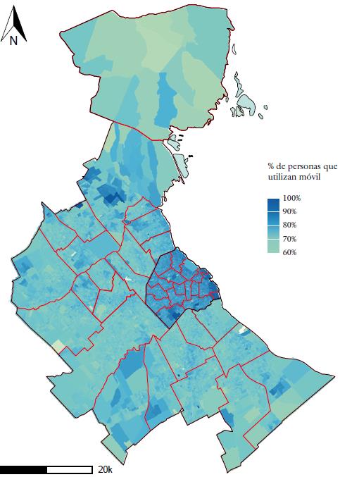 En la figura 5, 6 y 7 se presentan los porcentajes de acceso a TIC por radio censal. Como señalamos (véase apartado metodológico), estos mapas son el resultado de modelos de regresión sobre acceso a las tecnologías (móvil, ordenador e Internet, respectivamente). De ese modo, constituyen una aproximación al comportamiento territorial de acceso a las TIC. Como es posible apreciar en estas figuras, el acceso a las TIC en los diferentes territorios del GBA presenta un fuerte componente geográfico que se expresa a grandes escalas, pero también en una escala micro territorial. En particular, se observa que las desigualdades en el acceso dan cuenta y replican las desigualdades territoriales existentes en el GBA y descritas en el apartado anterior. Dicho esto, se observa que, dentro de cada una de las subregiones que componen el GBA, se repiten las diferencias y desigualdades que habíamos visto. En particular, esta diferencia se vuelve patente en el caso del uso de ordenador, donde se destaca claramente una marcada oposición norte-sur. A su vez, es necesario señalar algunos "enclaves" en los cuales el acceso a estas tecnologías parece ser contrastante con el de su entorno.