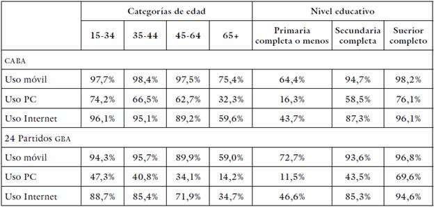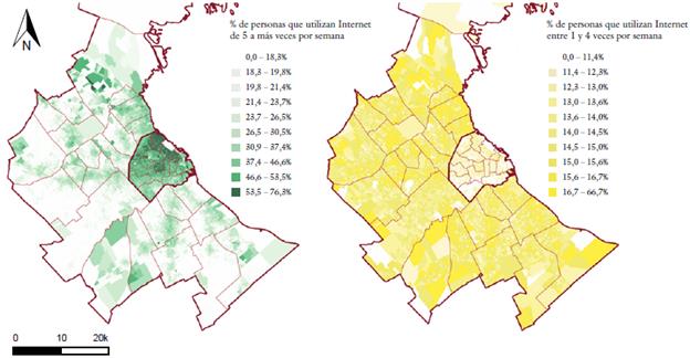 Hemos podido observar la brecha en el acceso a las tecnologías y a la conexión digital que existe en el GBA. A su vez, señalamos que estas diferencias pueden comprenderse en función de las profundas desigualdades sociales que engloba la región. Sin embargo, a la hora de pensar las potencialidades que el concepto de ciudad inteligente puede tener para el desarrollo de la ciudad, es necesario preguntarse no solo por el acceso, sino sobre todo por la frecuencia y las modalidades en las cuales se utilizan estas tecnologías.