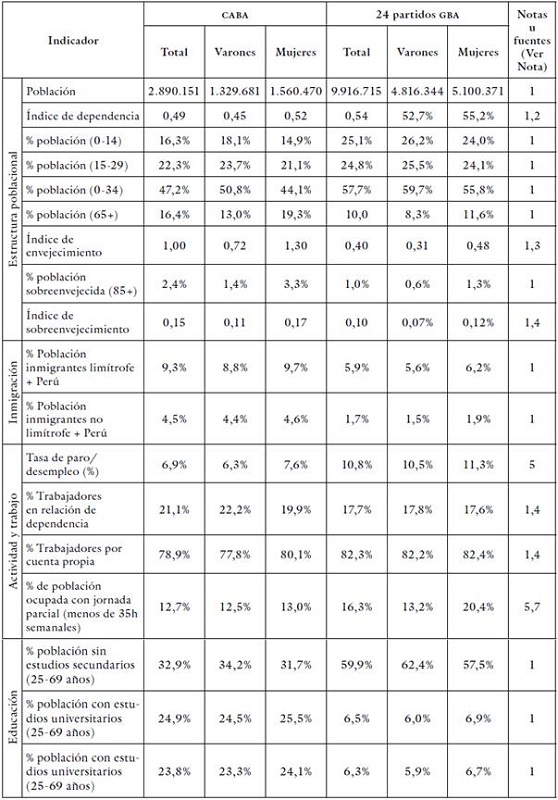 Los datos sociales y económicos de la región GBA, presentados en la tabla 2, dan cuenta de la heterogeneidad que existe entre la CABA y los 24 partidos. Por un lado, los partidos del GBA tienen la mayor tasa de desocupación y subocupación, así como los niveles de estudio más bajos. En contraste, la CABA presenta índices mejores en comparación con sus municipios vecinos. Por otra parte, la CABA presenta una estructura poblacional sumamente diferente a la de los otros territorios del GBA, con un importante nivel de envejecimiento.