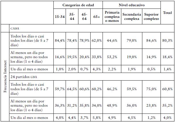 Respecto a el primero de estos aspectos, la tabla 5 presenta la frecuencia de uso de Internet para cada una de las regiones del GBA, diferenciando por grupo de edad y nivel educativo. Es necesario tener en cuenta que estos datos consideran solo a las personas que usan Internet, es decir, no expresan el porcentaje de uso total de estos grupos de población. Teniendo en cuenta esto, un primer elemento que vemos es que la frecuencia de uso de Internet parece reforzar y profundizar las desigualdades vistas anteriormente en cuanto a el acceso a dicha tecnología. En este sentido, son nuevamente las personas de la CABA quienes tienen un acceso más frecuente en todos los grupos de edad y nivel educativo. Más allá de esta similitud, vemos que en los grupos donde observamos el menor nivel de acceso (mayores de 65 años y sin secundaria terminada), las diferencias parecen reducirse drásticamente, volviéndose ambas regiones asimilables. Dentro de cada una de las subregiones, también las tendencias por edad y nivel educativo observadas respecto a el acceso se replican si consideramos la frecuencia de uso de Internet. Un asunto que resulta interesante destacar es que estas tendencias parecen ser más fuertes en lo que refiere al nivel educativo, reforzando la idea de que los usos más específicos e intensivos de las TIC están asociados fuertemente a aspectos socioeconómicos. Por su parte, referente a la edad, vemos que las diferencias no son tan marcadas en los 24 partidos del GBA como en la CABA. En términos generales estos resultados parecen señalar que el acceso desigual, visto en el apartado anterior, es potenciado por una diferencia en la intensidad de este acceso: los grupos con menores porcentajes de acceso son a su vez los que tienen un acceso menos frecuente.