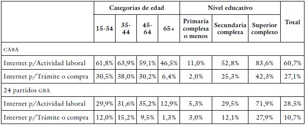 La frecuencia de uso nos proporciona una mayor precisión respecto a las diferentes relaciones que existen con las TIC en el GBA. Sin embargo, la frecuencia de uso no es el único elemento que permite entender estas desigualdades en el uso de las TIC. En ese marco, es posible profundizar el análisis distinguiendo entre diferentes "modalidades" de uso de Internet, en las cuales el contraste entre las regiones parece adquirir especial importancia. Teniendo en cuenta nuestro interés en las potencialidades que pueden tener las diferentes estrategias de desarrollo de una ciudad inteligente, nos hemos concentrado en dos modalidades particulares de uso de Internet fundamentales para aprovechar estas potencialidades: (a) el uso de Internet para tareas laborales; y (b) el uso de Internet para la realización de trámites o compras.