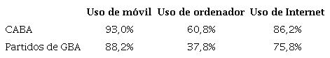 Con el fin de obtener una visión clara de las condiciones de acceso y uso de las nuevas tecnologías en el GBA, analizaremos estas diferencias a escala intrarregional (CABA vs 24 partidos), y micro territorial (radio censal). Si nos concentramos en el acceso a las tecnologías, los datos parecen replicar muchas de las desigualdades que configuran este territorio en otras dimensiones. A diferencia de los resultados obtenidos en otras ciudades (Barañano Cid et al., 2019) en el GBA encontramos un acceso desigual al uso de estas tecnologías, vinculado a las condiciones sociales y a las diferencias territoriales. Como primer acercamiento a esta situación, la tabla 3 presenta el nivel de acceso a TIC de los dos grandes espacios que conforman el GBA. Particularmente, respecto a ordenador e Internet, los partidos del GBA presentan usos sensiblemente menores al de los habitantes de la CABA. En el caso del uso de ordenador encontramos que esta diferencia es superior al 20 % entre ambas regiones. Esto se corresponde con la cada vez mayor especificidad de esta herramienta. En tal sentido, si bien en algunos ámbitos el ordenador ha sido desplazado por los teléfonos móviles cada vez más versátiles, esta herramienta sigue siendo central para los grupos que realizan un uso intensivo de las TIC. Por su parte, respecto a el uso del móvil, las diferencias son menos impactantes, aunque se conserva la diferencia en favor de la CABA (cercana al 5 %).