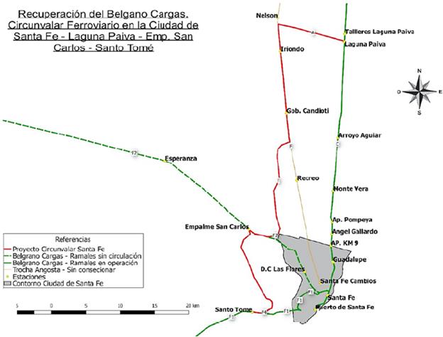 El PET 2018 planeaba la reactivación del transporte de carga sobre los rieles del Ferrocarril Belgrano Cargas, principalmente desde las provincias de Salta y Jujuy hacia el puerto de Rosario, tendencia que permite sostener la idea de continuidad con respecto a la planificación del PEt en el periodo neodesarrollista. Asimismo, en esa red se encuentra el Plan Circunvalar Santa Fe,4 proyecto que dio inicio al actual trabajo y que se halla representado en la figura 2. Aún con el cambio de gobierno, el PET sigue manteniendo su tendencia a la reactivación del sistema ferroviario existente, con el adicional de pretender revalorizar la región norte del país.