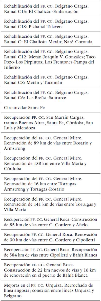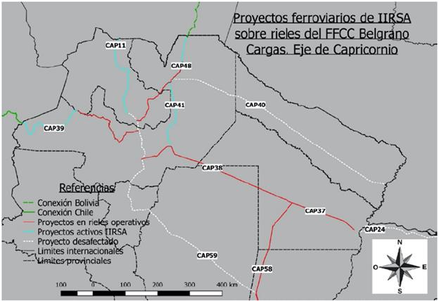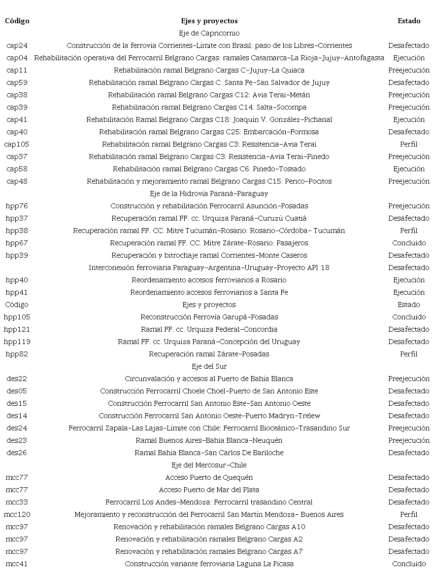 En lo que respecta a la cartera de proyectos de IIRSA presentada para el 2011, se encontraba compuesta de 531 proyectos, siendo 135 correspondientes al subsector ferroviario, atravesando total o parcialmente el territorio argentino 37 de estos (tabla 2). El eje que presenta mayor cantidad de proyectos ferroviarios es el Capricornio, con 13 propuestas (sobre los rieles del Belgrano Cargas) y 11 correspondientes al Eje de la Hidrovía Paraná-Paraguay (sobre las vías de los ferrocarriles Mitre y Urquiza), donde la estrategia perseguida es la rehabilitación de los ramales cerealeros para acceder a los puertos (Schweitzer, 2014).
