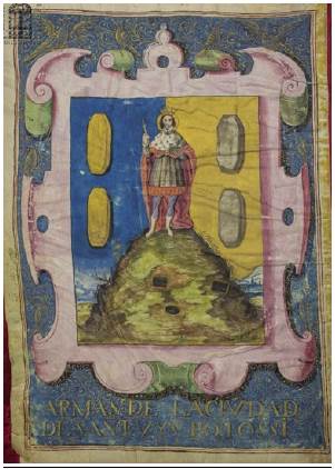 Mejía (2018) nos dice que todo bien cultural será definible, precisamente, a partir del significado inmaterial que le atribuyamos: testimonio de un acontecimiento histórico, de un modo de vida, etc. Así, el escudo de armas otorgado en 1656 por el virrey don Francisco Hernández de la Cueva, duque de Albuquerque, señaló para sus armas, en el centro, la representación del Cerro de San Pedro en campo azul y oro, con dos barras de plata y dos de oro, y sobre la cima del cerro la imagen de San Luis Rey de Francia que fue usado en la acuñación de monedas, papel moneda y sellos de cabildo, escudo de la ciudad y de la universidad con esta imagen (véase figura 1).