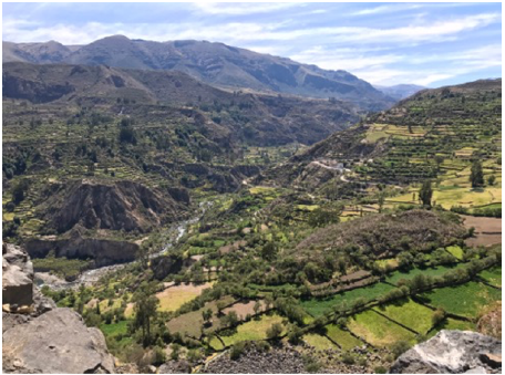 La población dispersa presenta una ocupación territorial de muy baja densidad, referida a centros poblados menores con fuerte relación con sus entornos rurales, como en el Valle Sondondo, región Ayacucho, en el sur andino del Perú. La particular ocupación dispersa en un territorio de empinadas pendientes, además de otras características geográficas, hace pertinente la construcción de andenerías1 ancestrales, que ocupan varios kilómetros, con importantes diferencias de altitud y temperatura que propician la diversidad productiva agrícola y ganadera (figura 1). Actualmente, el valle Sondondo es patrimonio cultural peruano (Ministerio de Cultura, 2017) y sus pendientes incluyen andenes, terrazas, parcelas, caminos, cochas, árboles, entre otros. De esta manera, se constituye un paisaje de relaciones espaciales y capas históricas coherente con el enfoque territorial, que enfatiza la condición relacional e integral (Magnaghi, 2014; Beuf, 2017).