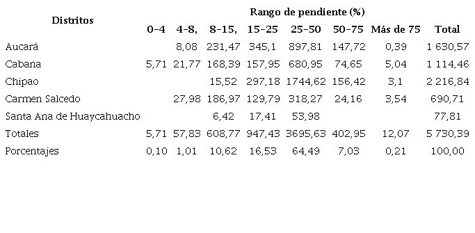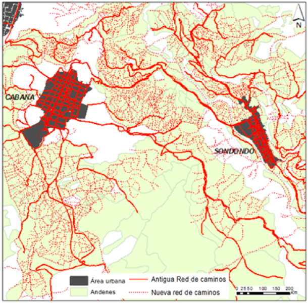La localización cerca de la producción agrícola y/o pecuaria o de la infraestructura de la red hídrica es práctica y esencial para la vida en el Valle. Ello explica los diferentes tamaños de asentamientos humanos en las regiones Quechua, Suni y Puna. Como la mayor cantidad de andenerías están en la región Quechua, los asentamientos de mayor tamaño poblacional también (figura 7). Los porcentajes más altos de áreas de cultivo en andenería se sitúan en pendientes relativamente favorables para la accesibilidad a pie (en pendientes de 15-25 % y 25-50 %) (tabla 8). En el conjunto de asentamientos en región Quechua, los centros poblados están próximos a las áreas agrícolas y son de fácil accesibilidad.
