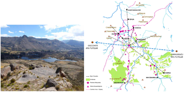 Las visuales en los desplazamientos a pie son útiles para obtener información de las actividades de producción e infraestructura. Por ejemplo, la piedra-maqueta Luichimarca, a 3 500 m s. n. m., es un punto visual estratégico y de dominio de extensas andenerías (AUTS-2018, 2018; Aparicio & Clavera, 2017; Canziani, 2021), que permite la visibilidad de Cabana y sus espacios agropecuarios, de Aucará, y de Sondondo, y de los apus tutelares Occonta y Carhuarazu (figura 13). Estas relaciones visuales son parte de "la gran interconexión desde la red de caminería como complemento para la generación de espacios y redes simbólicos de tránsito, que hoy continúan vigentes y activas en la población actual" (Aparicio & Clavera, 2017, p. 112). Esto permite las relaciones visuales de dominio del territorio.