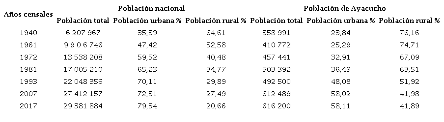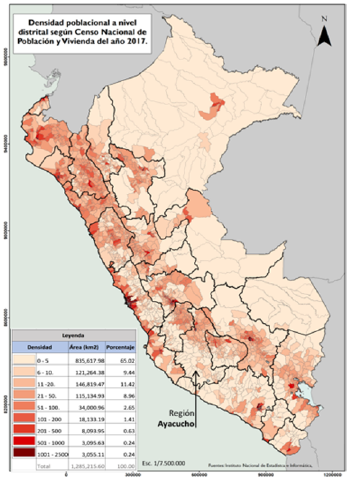 En el Perú, la dispersión poblacional corresponde al 27,82 % de la población, que se ubica en centros poblados y asentamientos de menos de 5 000 habitantes (tabla 1). Del censo 2007 al 2017, de un total de 1 874 distritos, 1 240 decrecieron en población (INEI, 2017). Debido a la migración interna,2 con una dinámica importante en la ocupación territorial, este decrecimiento sustantivo de la población se mantiene en regiones andinas como Ayacucho (figura 2), con altos porcentajes de población rural. Se estima que, en el Perú, la densidad menor de 5 hab./km2 ocupa el 65,02 % de la superficie y, en particular, el 37 % de las regiones naturales:3