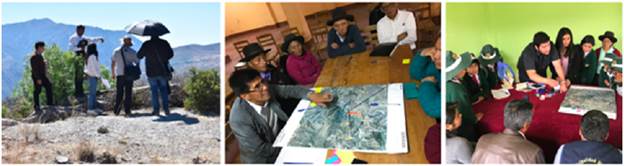 Esta información fue sistematizada, y paralelamente valorada con el trabajo de campo en 2018, 2019 y 2022. Mediante recorridos territoriales como estrategias de encuentro, discusión e intercambio desde una experiencia compartida (Declève et al., 2002); entrevistas, mesas de trabajo (figura 3) y registros fotográficos, con autoridades locales y comunales, funcionarios municipales, de educación y salud, comerciantes y miembros de la comunidad. La información cualitativa se organizó en: (a) valoración de los componentes de las redes territoriales ponderando la pendiente y las diferencias altitudinales (AUTS-2018, 2018; AUTS-2019, 2019); y (b) continuidad de las redes territoriales (AUTS-2019, 2019; AUTS-2020, 2020), que vincula a la población con sus actividades económicas en diferentes escalas territoriales. Esta información fue sustancial para valorar y explicar la relación entre la estructura territorial, las características demográficas y dinámicas de desplazamiento de la población.