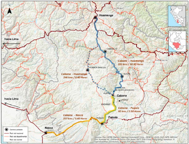 Cabe resaltar que el valle de Sondondo está ahora mejor conectado por mejora de vías, y permite un desplazamiento cotidiano mayor hacia ciudades más grandes como Puquio y en la región Chala, al igual que migraciones. El acceso al valle es por Puquio (capital de la provincia Lucanas), que está muy bien conectada con Nasca (región Chala), a una distancia de 165 km, que desde 2010 se recorren en 3 horas (frente a 3:45 horas anteriormente) gracias a la nueva vía Interoceánica Sur: Nasca-Puquio-Abancay-Cusco. La distancia entre Puquio y Cabana es de 92 km (1:50 horas), trayecto reducido por el mejoramiento de la vía Puquio-Cangallo-Huamanga en 2010. La distancia a la capital regional, Huamanga, es de 246 km (6:30 horas) por la vía Huanca-Sancos, pero diversos servicios de transporte optan por la vía Sucre, que recorre más centros poblados y es conocida como la "ruta de pueblos" (10:30 horas). Se destaca la diferencia altitudinal de 3 000 m entre Nasca (a 520 m s. n. m.), Puquio (a 3 210 m s. n. m.) y Cabana (a 3 310 m s. n. m.), en un recorrido de 260 km y 5:40 horas (figura 4).