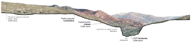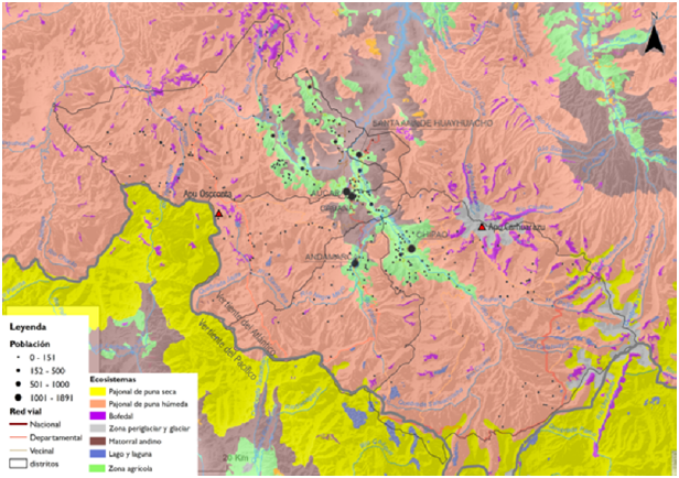 Estos asentamientos poblacionales y centros poblados se encuentran en altitudes que van de 2 300 a 4 500 m s. n. m., con 2 000 metros de diferencia altitudinal en distancias de 15 a 20 km que se alternan con pampas (figura 5). Esta dispersión poblacional se explica por la concatenación espacial de actividades orientadas a la producción agropecuaria en un espacio vertical. La actividad agrícola y pecuaria existe mediante el “control vertical y manejo paralelo de una serie de ciclos de producción agropecuaria” (Golte, 1987, p. 14), lo que se establece con diferentes modalidades de interacción social y se fundamenta en una estructura territorial compuesta por redes territoriales.