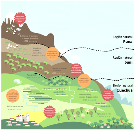 Pero esta concatenación de actividades tiene problemas de reducción de manantes debido al cambio climático, la deforestación y pérdida de biodiversidad, el sobre-pastoreo, las quemas y el desecamiento de caudal ecológico; de desestabilización de laderas, debido a la degradación y la erosión de sedimentos; y de pérdida de agrodiversidad, estrés hídrico y contaminación química, lo que genera desestabilización de terrazas y andenes y pérdida de fertilidad, así como un incremento de la inseguridad alimentaria (Prodern, 2015). Cabe resaltar lo poco que valoran los programas públicos la relación entre la población dispersa y su estructura territorial, al no ser integrales y focalizarse solo en algún aspecto de productividad agropecuaria (ej. mejora de alguna crianza de animales) o desplazamientos (ej. mejora de asfaltado de vías).