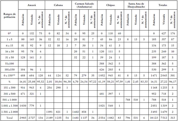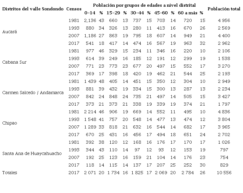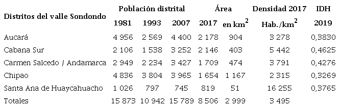 La población del valle Sondondo es de 10 483 habitantes, en 5 distritos:9 Aucará, Cabana, Carmen Salcedo, Chipao y Santa Ana de Huaycahuacho, en una superficie de 2 999 km2, con una densidad de 3,5 hab./km2 (INEI, 2018). Sus índices de desarrollo humano (IDH) (IPE, 2021) varían entre 0,3269 y 0,4625 según el distrito, frente al promedio nacional de 0,5858, y de la región, de 0,4327. La población se localiza en centros poblados menores (capitales de distrito) y asentamientos poblacionales10 de tamaño heterogéneo (tabla 7), y ha estado expuesta a cambios importantes en su estructura poblacional y desigualdad territorial.