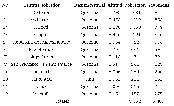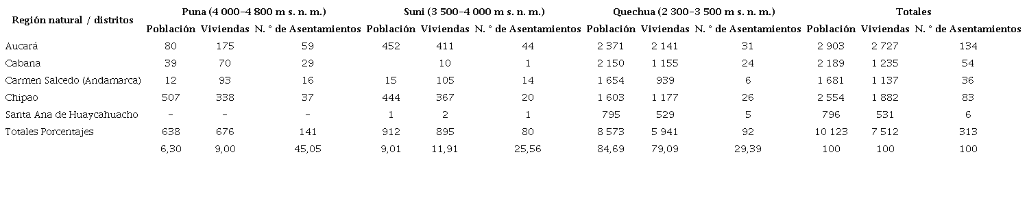 La población en el Valle se ubica en tres regiones naturales (tabla 5): un 6,30 % del total en Puna, un 9,01 % en Suni (15,31 % entre ambas) y un 84,69 % en Quechua, por tener un clima más templado, y suelos de valor agrológico. Por ello, los andenes se localizan en esta región y requieren de 'más gente para el trabajo'. Chipao y Aucará, los distritos con mayor número de asentamientos y mayor porcentaje de población en Suni y Puna, comprenden espacios de mayor altitud, como el apu nevado Carhuarazu, en Chipao, y el apu Oscconta, en Aucará, y extensas zonas altas de pastoreo, que requiere de 'menos gente para el trabajo'.