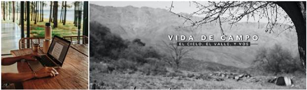 Las motivaciones residenciales son estimuladas a partir de consignas que abundan en pronombres personales en primera persona. Se recurre a un ideario presentista, individualista y aislacionista (barrio serrano residencial, privado, exclusivo) que agencia un traslado a la naturaleza en busca de una experiencia personal de autorrealización -supuestamente- oprimida por los avatares de la vida urbana: "En Traslasierra está tu campo, tu tierra, tu lugar. El cielo, el valle y vos" (figura 6). El resultado es un movimiento que desestima el costo social, económico y ambiental de esa urbanización para vivir de un modo atomizado (Capel, 2009). Como lo revela el mecanismo discursivo de un grupo desarrollista de la ciudad de Alta Gracia: