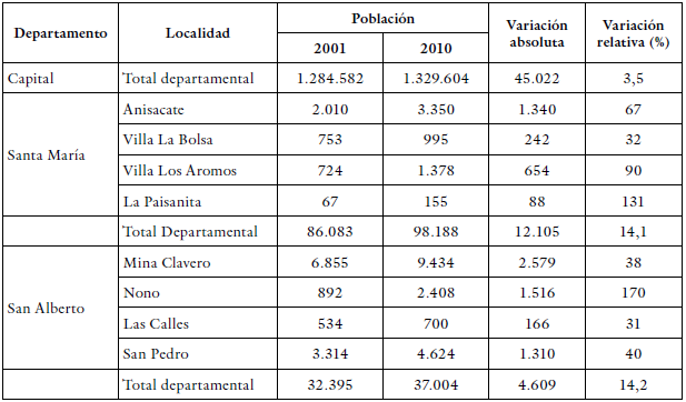 Entre los años 2001 y 2010 la Provincia de Córdoba registró un crecimiento demográfico de un 7,89 %, y su ciudad capital, tan solo de un 3,5 % (INDEC, 2010). En cambio, las localidades que conforman el Área Metropolitana de Córdoba y los valles serranos, presentaron durante ese período signos de un crecimiento considerable (tabla 1). En esta línea se inscribe el valle de Paravachasca, que registró un aumento intercensal del 14,1 %. Los datos permiten inferir que al tiempo que las grandes ciudades vienen sorteando un proceso de estancamiento y desaceleración de su crecimiento -manteniendo un porcentaje de población relativamente estable-, los pueblos y las pequeñas ciudades de la periferia crecen de manera exponencial.
