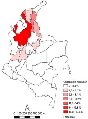 Mayoritariamente estos provenían de Bolívar (22,19 %), Antioquia (18,70 %) y Cesar (10,95 %), territorios limítrofes y pertenecientes a la región del Magdalena Medio. Según el mismo relevamiento censal, 8.215 personas declararon ser migrantes interdepartamentales que arribaron a la ciudad entre los años 2000 y 2005. Como se puede observar en el mapa que se presenta a continuación, la mayor parte de las corrientes migratorias que tuvieron como destino Barrancabermeja son de corta distancia y corresponden con las zonas rurales del Magdalena Medio más afectadas por el conflicto armado.