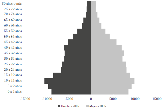 El conflicto armado afecta de forma diferenciada a las personas según su edad y sexo: "mientras los hombres son los más afectados por las muertes directas, las mujeres son forzadas a migrar" (Salaya & Rodríguez, 2014, p. 162). La pirámide de población (figura 4) de Barrancabermeja en 2005, que se observa a continuación, tiene una base ancha que se hace angosta en los hombres en edades entre los 20 y los 40 años frente a las mujeres en esa misma etapa de vida. Estos datos nos permiten una primera aproximación a las consecuencias demográficas de la guerra en Barrancabermeja, teniendo en cuenta que en la ciudad hubo al menos 39 masacres desde 1980 (Observatorio de Derechos Humanos y la Paz, 2014), además de tener tasas de homicidios tres veces más altas que el promedio nacional (Gill, 2009). Estos datos podrían vislumbrar la estrecha relación entre las características de la estructura poblacional y la existencia de un intenso conflicto armado en el territorio.