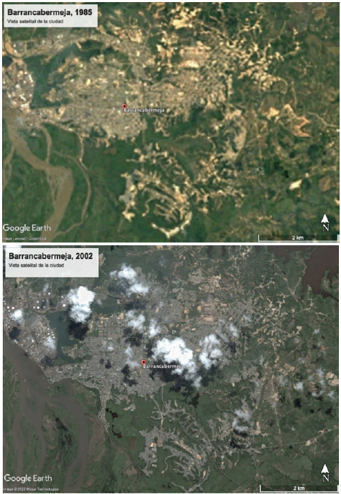 En las fotografías satelitales de 1985 (figura 5) y 2002 (figura 6) se observa el crecimiento de la ciudad, especialmente en la zona oriental (teniendo como excepción el barrio el Arenal, también de origen informal en la primera comuna de la ciudad). Como resultado del proceso de producción del hábitat popular, según los relevamientos hechos por el municipio, en 2001 el 58 % de las viviendas de la ciudad estaban localizadas en zonas subnormales (Barrancabermeja, 2001). Esa denominación hace referencia a viviendas en las cabeceras municipales sin conexión apropiada a los servicios públicos.
