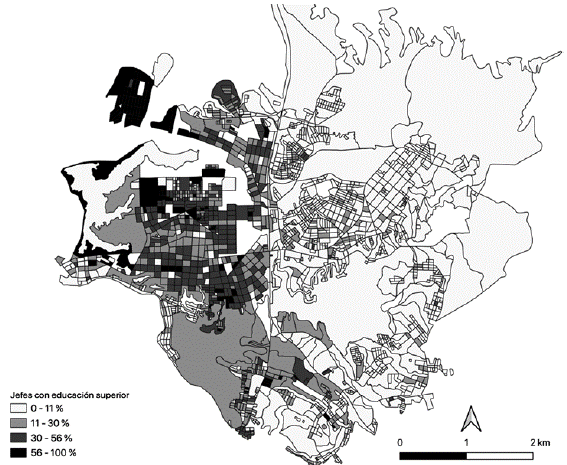 El mapa anterior (véase figura 7) da cuenta de la fragmentación y segregación socioresidencial de la población de la ciudad. Tomamos como proxy de clase el nivel educativo, y filtramos a la población por aquellos jefes de hogar que cursaron estudios superiores o más. El resultado obtenido vuelve a evidenciar la frontera marcada por las vías del ferrocarril como límite que separa realidades contrastantes para los habitantes de la ciudad. Los barrios al interior de la refinería designados a empleados administrativos presentan altos niveles de escolarización, al igual que el centro de la ciudad, exceptuando el barrio Arenal también de origen informal, que comparte niveles de educación similares a las comunas 5, 6, 7 en el oriente de la ciudad.