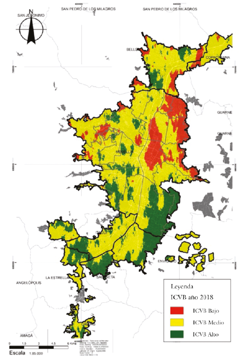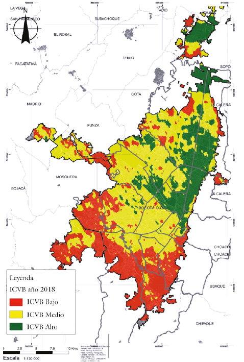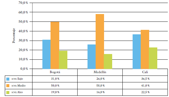 En el caso de la aglomeración de Bogotá, la distribución del ICVB por cantidad de población indica que el 31 % está en un rango bajo, el 50 % se puede catalogar como medio y el 19 % restante corresponde a un ICVB alto. En la aglomeración de Medellín, con un ICVB bajo se clasifica al 26 % de la población, con un ICVB medio el 58 % y el 16 % con un ICVB alto. Por último, en Cali los resultados indican que en ICVB bajo se encuentra el 36 %, mientras que la población con ICVB medio es del 41 % y con ICVB alto es del 22 %.