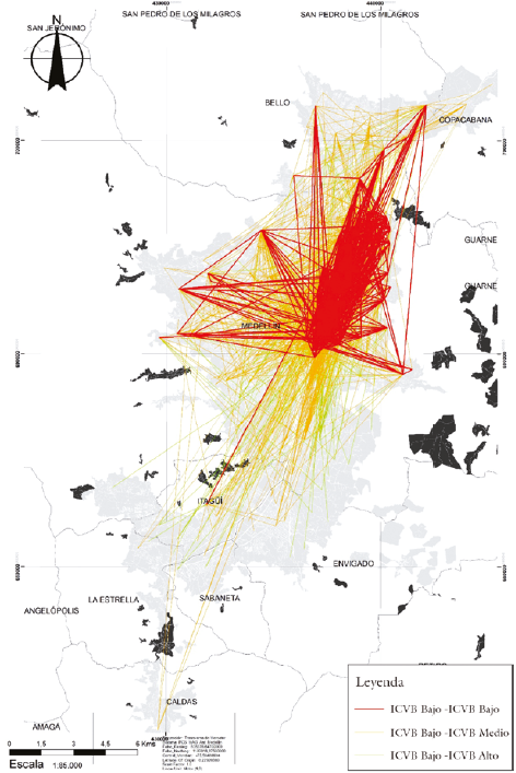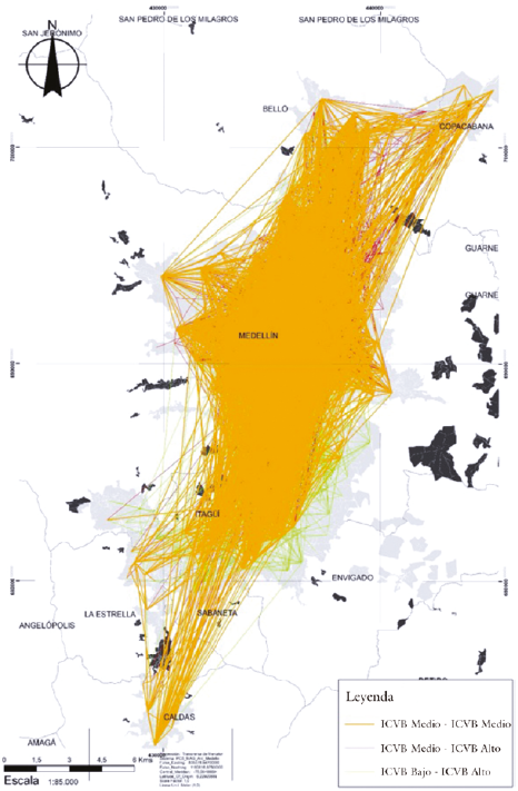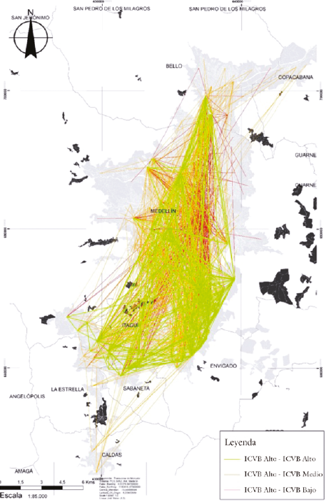 En Medellín se identifica una alta densidad de viajes en sectores de ICVB bajo en el nororiente de la aglomeración, con una fuerte relación con el municipio de Bello (ver figura 10).