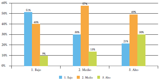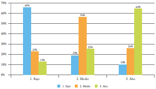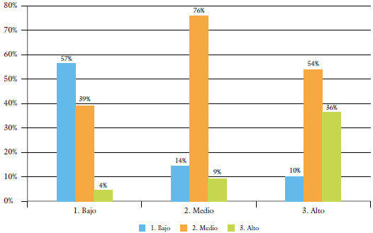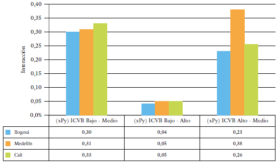 Al estimar los indicadores de interacción en las tres aglomeraciones, se obtiene como resultado que hay una baja probabilidad de interacción a escala de barrio. La probabilidad de interacción de grupos bajos y altos está entre el 4 % y el 5 % en las tres aglomeraciones, lo cual da cuenta de una altísima segregación a la escala más próxima de interacción social de los dos grupos que se encuentran en los extremos del nivel socioeconómico. Por otro lado, la interacción entre población con ICVB medio y bajo es la más homogénea en las tres aglomeraciones, y se encuentra en un rango de entre el 30 % y el 33 %, lo cual indica la mayor proximidad espacial de estos dos grupos. Con respecto a la interacción entre población con ICVB medio y alto a escala de barrio, mientras que en Bogotá y Cali se encuentra por debajo del 30 % y en el caso de Medellín muestra que la probabilidad de interacción en el barrio es del 40 %, lo cual resalta la importancia porcentual que tiene el ICVB medio entre la población de Medellín (ver figura 5).