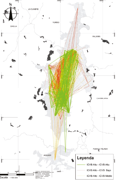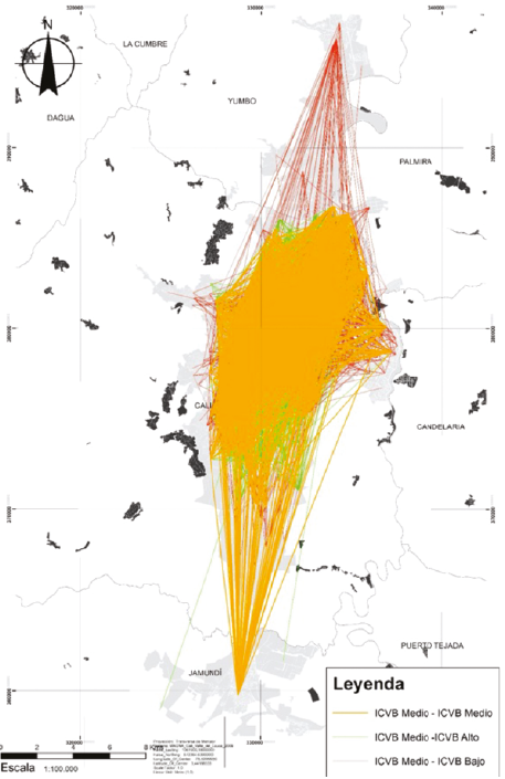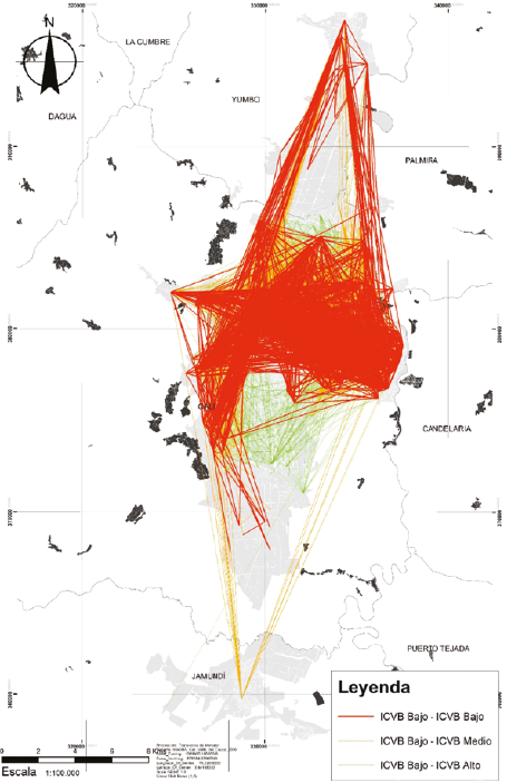 Si bien en Cali se encuentra un peso significativo de los viajes provenientes de sectores con ICVB bajo o alto hacia sectores con ICVB medio, los bajos porcentajes de viajes hacia destinos contrarios permite comprobar la baja probabilidad de interacción identificada previamente.