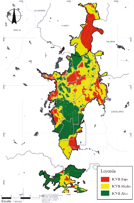 Por último, la figura 4 presenta la distribución del ICVB en la aglomeración urbana de Cali, en la cual se evidencia que los grupos con ICVB alto se localizan en una cuña que bordea la aglomeración por el occidente en dirección sur norte, en relación con el municipio de Jamundí. La distribución de grupos con ICVB bajo muestra que hay una mayor concentración en el Distrito de Agua Blanca al oriente de la ciudad, sobre los bordes del río Cauca, y una concentración menor en el sector de Siloé sobre la cordillera occidental. Se resalta un conglomerado de ICVB bajo en el municipio de Yumbo, el cual se encuentra al norte de la aglomeración urbana (Mayorga, 2021).