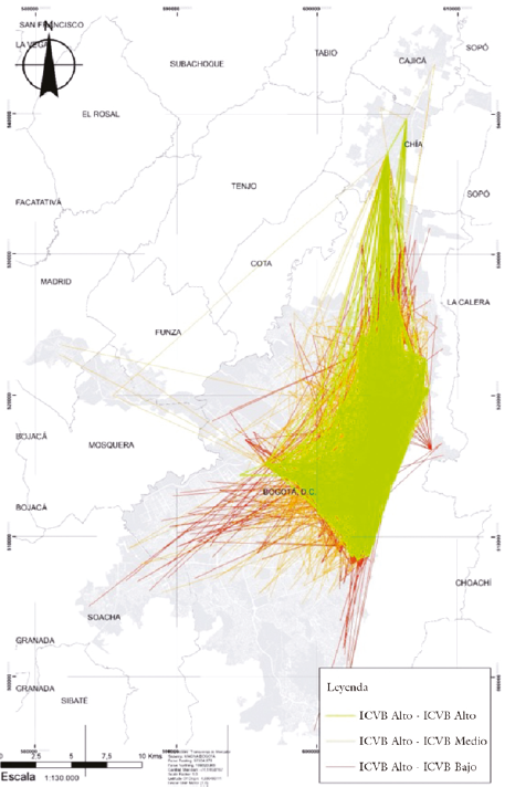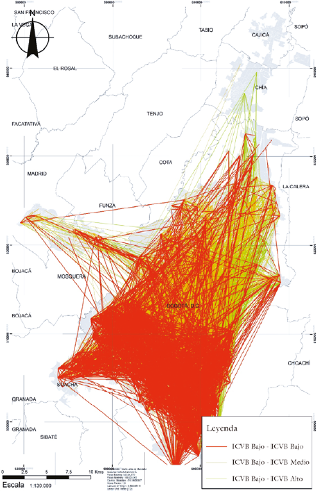En el caso de Bogotá, se puede observar que hay una alta densidad de viajes entre sectores de ICVB bajo en el sur de la ciudad, principalmente entre las localidades de Usme, Ciudad Bolívar, Tunjuelito, Bosa y Kennedy y con una intensa relación con el municipio de Soacha (ver figura 6). Los viajes que se originan entre grupos con ICVB alto, presentan un patrón de concentración desde el centro y hacia el norte de la ciudad acorde con la distribución de la cuña de alta renta al oriente. Estos viajes se relacionan de manera más intensa con los municipios de Chía y Cajicá al norte de la aglomeración (ver figura 7). Por último, los viajes que se originan en grupos con ICVB medio mantienen una mayor heterogeneidad, pero tienden a concentrarse menos hacia el sur de la aglomeración.