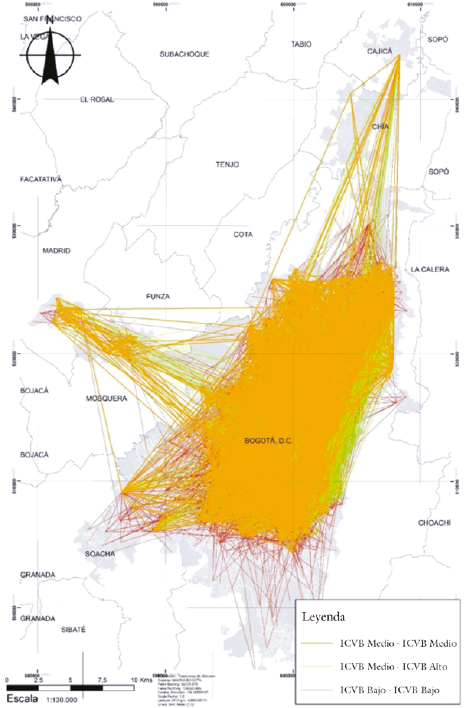 Sin embargo, los viajes hacia sectores de ICVB bajo son significativamente bajos lo cual confirma el indicador de interacción y se demuestra que no hay una movilidad cotidiana que permita una interacción entre estos dos grupos de población.