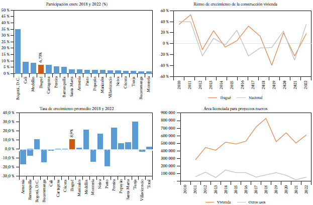 De hecho, Ibagué actualmente está entre las diez ciudades que más crecen en el país en el número de licencias de construcción otorgadas por año, y recientemente aumentó la participación nacional en el otorgamiento de áreas nuevas para construcción de vivienda, pasando del 3 % en 2010 al 5 % en 2019. En ese sentido, la ciudad hoy por hoy crece al 8,9 % en la dinámica inmobiliaria y tiene una tendencia un poco más marcada con respecto al promedio de ciudades colombianas (figura 1).
