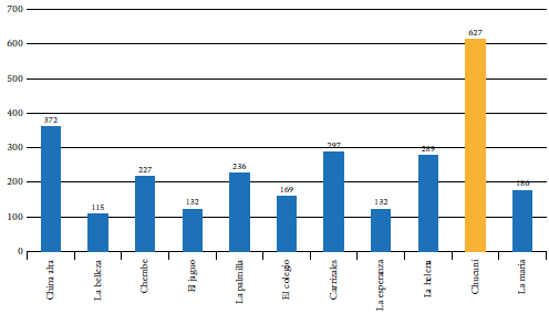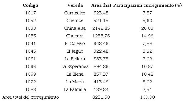 Con respecto a la población, según proyecciones del DANE 2012, la mayor proporción del corregimiento está en la Vereda Chucuní (627 hab.), seguida de China Alta (372 hab.), Carrizales (297 hab.), La Helena (289 hab.), concentrando un total de 1585 habitantes correspondientes al 56,97 % de la población total del corregimiento (figura 3).