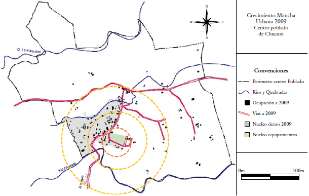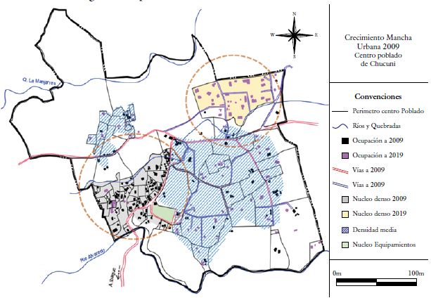 También, se pudo evidenciar la conformación de un Núcleo de alta densidad de ocupación, con tendencia al crecimiento urbano de carácter radial, a partir de un centro geométrico generado en el núcleo de equipamientos existente (parque, iglesia y centro de salud), por lo que cabe anotar que esta zona es reconocida por ser donde tuvo su origen el centro poblado hace más de 80 años.