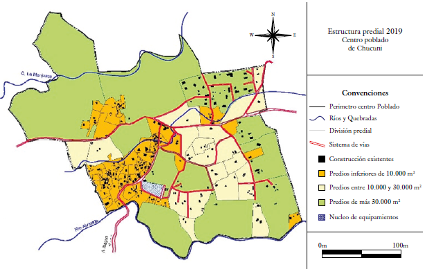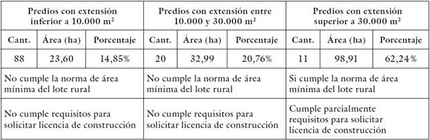 Así, a nivel de tenencia de la tierra se destaca como particularidad que cerca del 40 % de los predios del centro poblado no cumplen con la extensión mínima para lotes rurales (30 ha o 30.000 m2), contradiciendo lo establecido por la ley. Lo anterior, implica que ninguno de los predios tiene la posibilidad de solicitar licencia de construcción, dejando en evidencia la expansión urbana en entornos especulativos y la ilegalidad de construcciones existentes en dichos suelos.