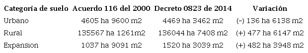 En cuanto a la clasificación del suelo municipal se manejan las mismas categorías y definiciones establecidas en el Acuerdo 116 del 2000, pero se presentan cambios en sus áreas, tal como se muestra a continuación en la tabla 1: