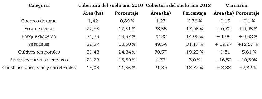 Da acuerdo a lo anterior, en primera instancia, se logró la caracterización de los tipos de cobertura presentes en el área, entre los que se identificaron las categorías de bosque denso, bosque disperso, pastizales, cuerpos de agua, cultivos temporales y suelos expuestos o erosivos, los cuales se cuantificaron estableciendo y midiendo los correspondientes polígonos marcados digitalmente sobre dos aerofotografías correspondientes a los años 2010 y 2018, lo que permitió comparar e identificar los cambios más representativos en el transcurso de 8 años.