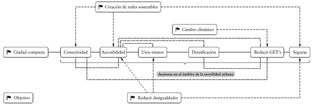 Producto de estas agendas y enfoques se pueden identificar cuatro grandes objetivos en pro de la movilidad sostenible, a saber: promover la ciudad compacta, hacer frente al cambio climático, la reducción de las desigualdades y finalmente, la creación de redes accesibles, seguras e interconectadas a diversos equipamientos. La figura 1 da cuenta de estas apuestas, pero también de su interrelación a través de acciones concretas en el ámbito de la movilidad urbana que construyen ciudades más vivibles.