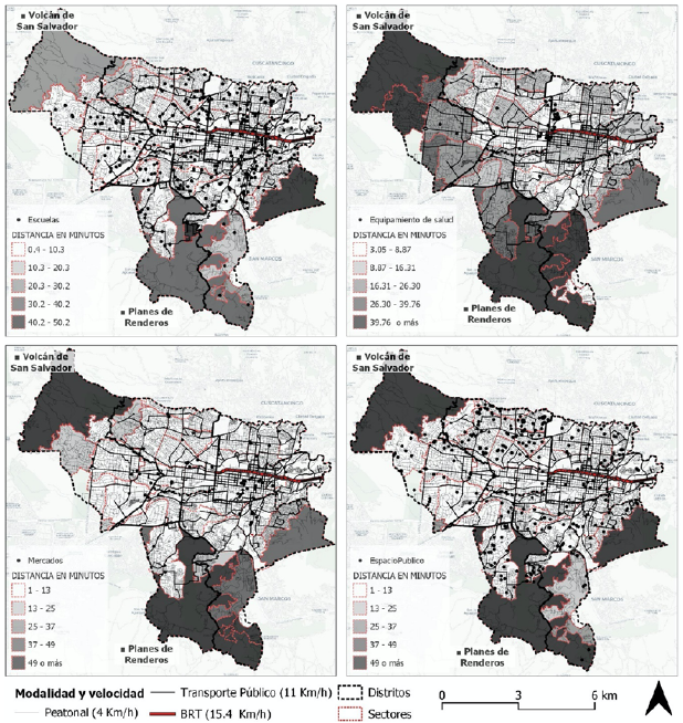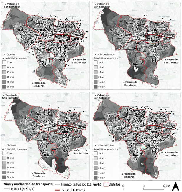 En ese sentido, esta investigación aporta al proceso de planificación, localización e indicadores que sugieren la situación de áreas excluidas de la jerarquización de la escala metropolitana debido al aumento de tiempo para acceder a equipamientos urbanos, sobre este punto, nótese el contraste entre las figuras 9, 10 y 11, específicamente en el área que corresponde a San Salvador, estos datos plantean retos concretos para transformar las condiciones de exclusión e inequidad en la distribución de los beneficios de la movilidad urbana sostenible.