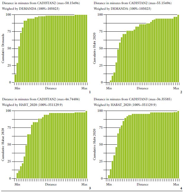 El software Flowmap es open source y permite obtener como indicadores de eiciencia espacial: la distancia (en minutos) máxima, mínima y promedio de los centroides de los distritos hacia los equipamientos, así como la demanda total cubierta de los centros de servicios. Respecto a los indicadores de equidad espacial se obtienen la distribución de la demanda según intervalos de tiempo al centro más cercano, esto es tabla de frecuencia absoluta y relativa, percentiles e histograma, siendo este último el que se presenta como resultado, además se valoran las desigualdades territorial existentes, con la desviación típica de los desplazamientos al centro más próximo y inalmente la diferencia entre el tiempo máximo y mínimo al centro de servicio y el índice y coeiciente de Gini para las condiciones de equidad en la accesibilidad del territorio a los equipamientos urbanos.