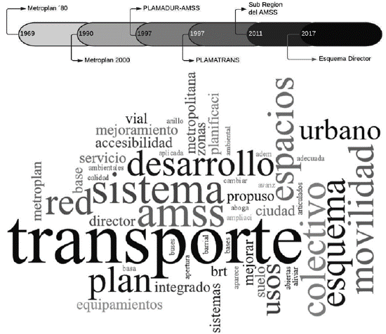 El AMSS ha suscitado gran parte de los ejercicios de planificación realizados en El Salvador, se identifican como relevantes al menos cinco planes desde 1969 hasta el 2017, la figura 3 muestra una línea del tiempo en la que han sucedido y la nube de 50 conceptos más relevantes que han aportado estos ejercicios en los apartados que abordan lo relacionado con el transporte y la movilidad urbana.